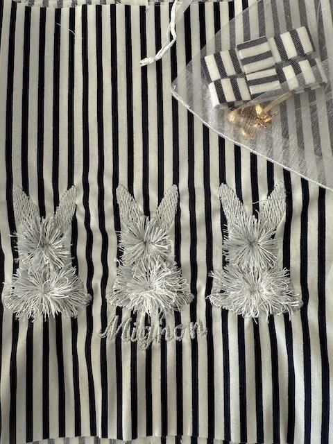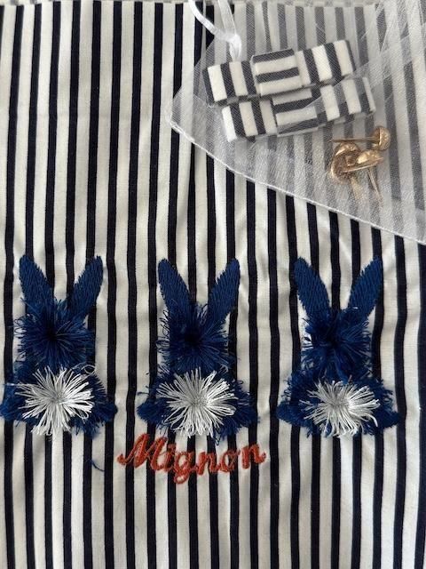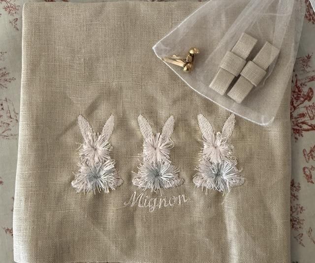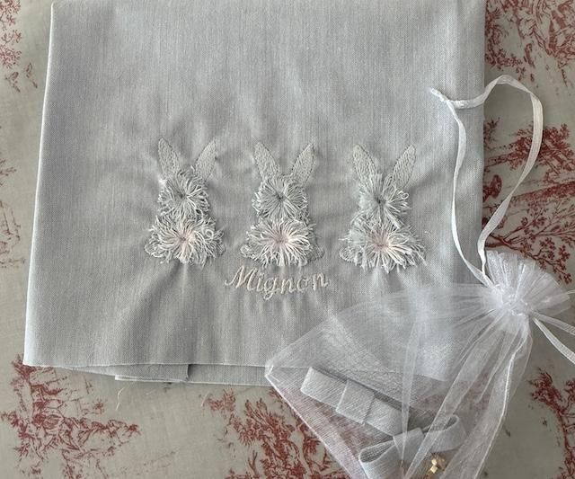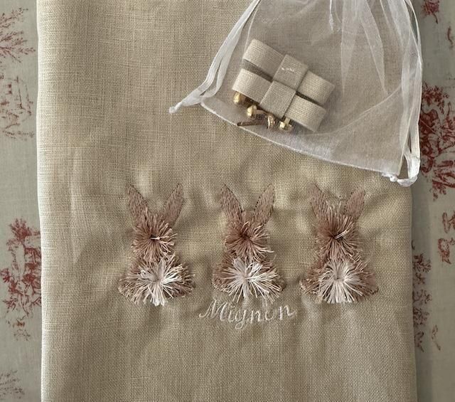 ナチュラルなリネン地にうさぎの刺繍をあしらい、サイドにはリボンをプラス。
